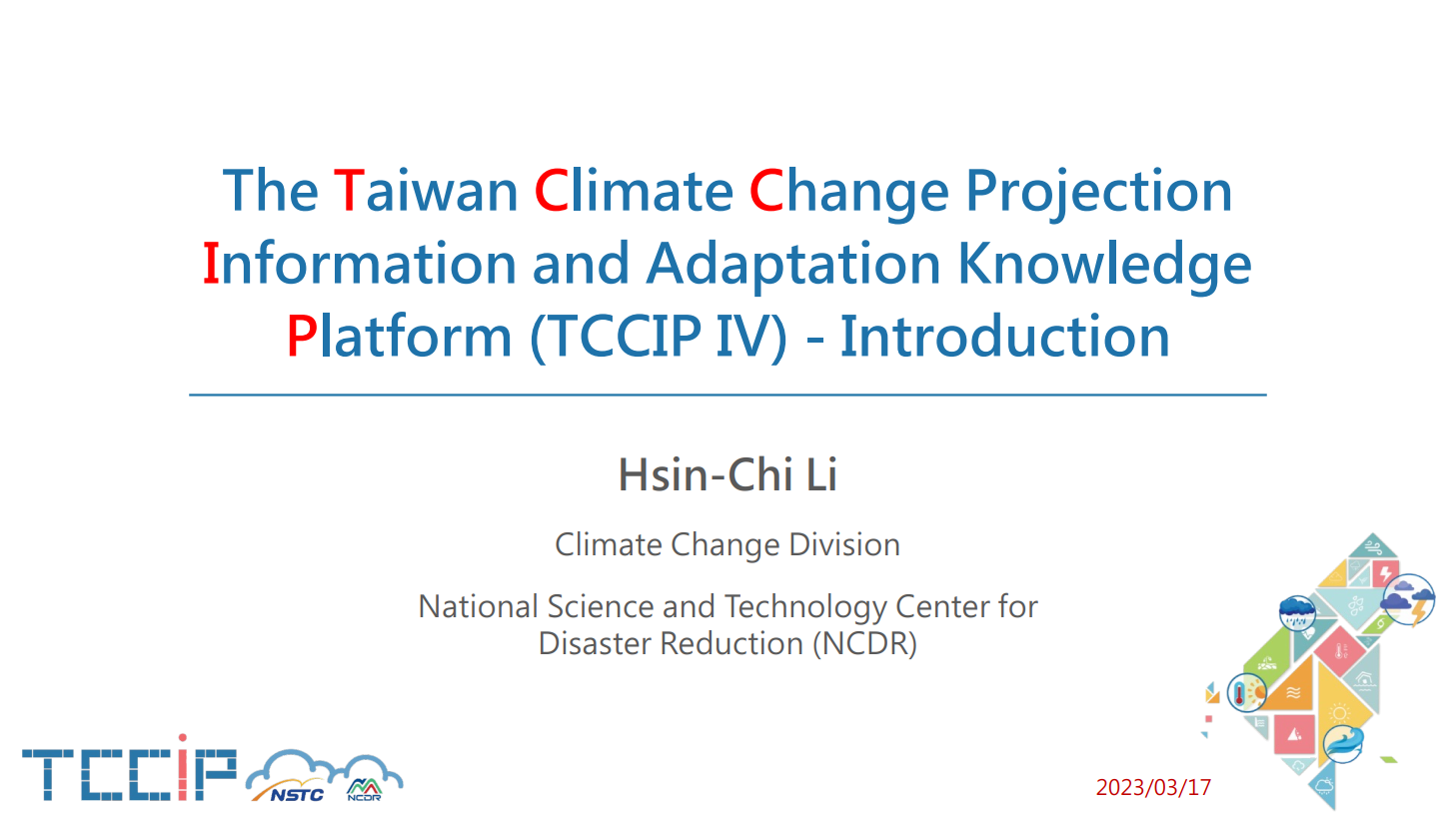 The Taiwan Climate Change Projection Information and Adaptation Knowledge Platform (TCCIP) coordinated by National Science and Technology Center for Disaster Reduction (NCDR) is one of three major climate change projects funded by National Science and Technology Council. The TCCIP project not only produces climate change data for impact assessments and adaptations but also aims to support national adaptation policy framework.