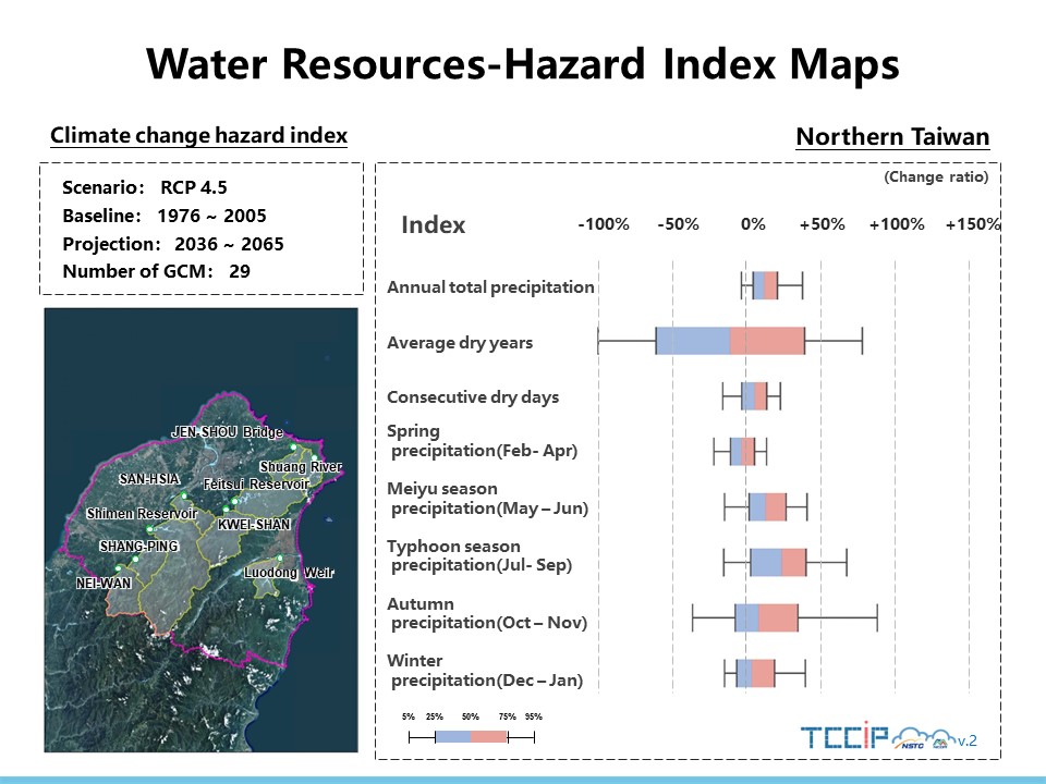 Under the IPCC AR5 RCP4.5 scenario, hazard indicator values for watersheds in the northern region were projected for the mid-21st century (2036–2065), and the rates of change were calculated relative to the baseline period (1976–2005). Results from 29 GCM ensembles indicate that, for watersheds in the northern region:.The mean rate of change in the annual average precipitation indicator is 13%, with an inter-model spread ranging from 4% to 20%..The mean rate of change in the frequency of dry years is −9%, with an inter-model spread ranging from −56% to 46%..The mean rate of change in the annual average number of non-rainfall days is 4%, with an inter-model spread ranging from −1% to 13%..The mean rate of change in spring rainfall is −4%, with an inter-model spread ranging from −11% to 5%..The mean rate of change in Meiyu (plum rain) season precipitation is 14%, with an inter-model spread ranging from 2% to 26%..The mean rate of change in typhoon-season precipitation is 23%, with an inter-model spread ranging from 3% to 39%..The mean rate of change in autumn precipitation is 15%, with an inter-model spread ranging from −8% to 32%..The mean rate of change in winter precipitation is 6%, with an inter-model spread ranging from −7% to 18%.(Inter-model spread is defined as the interquartile range, i.e., the first and third quartiles.)
