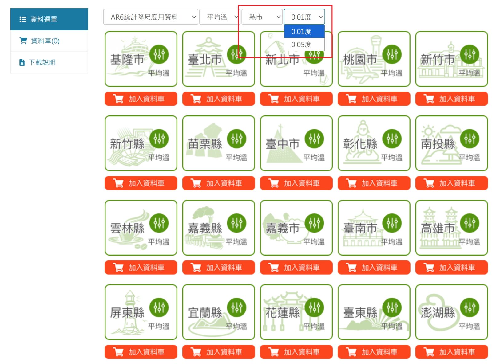 月資料下載請點選 AR6統計降尺度月資料->任一變數->縣市->0.01度