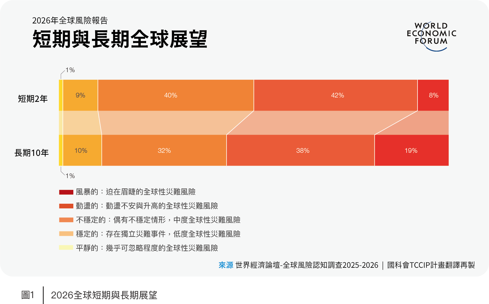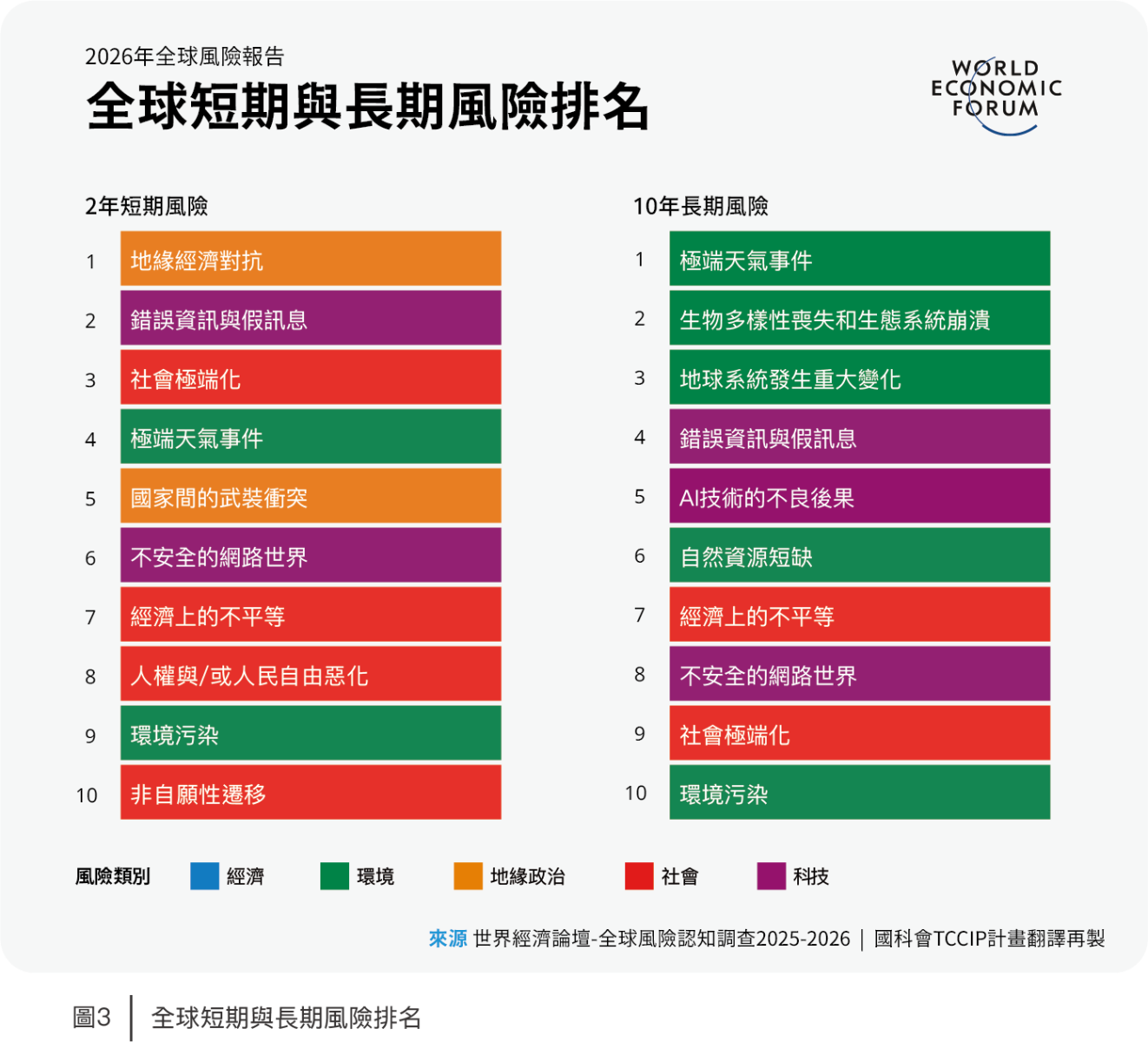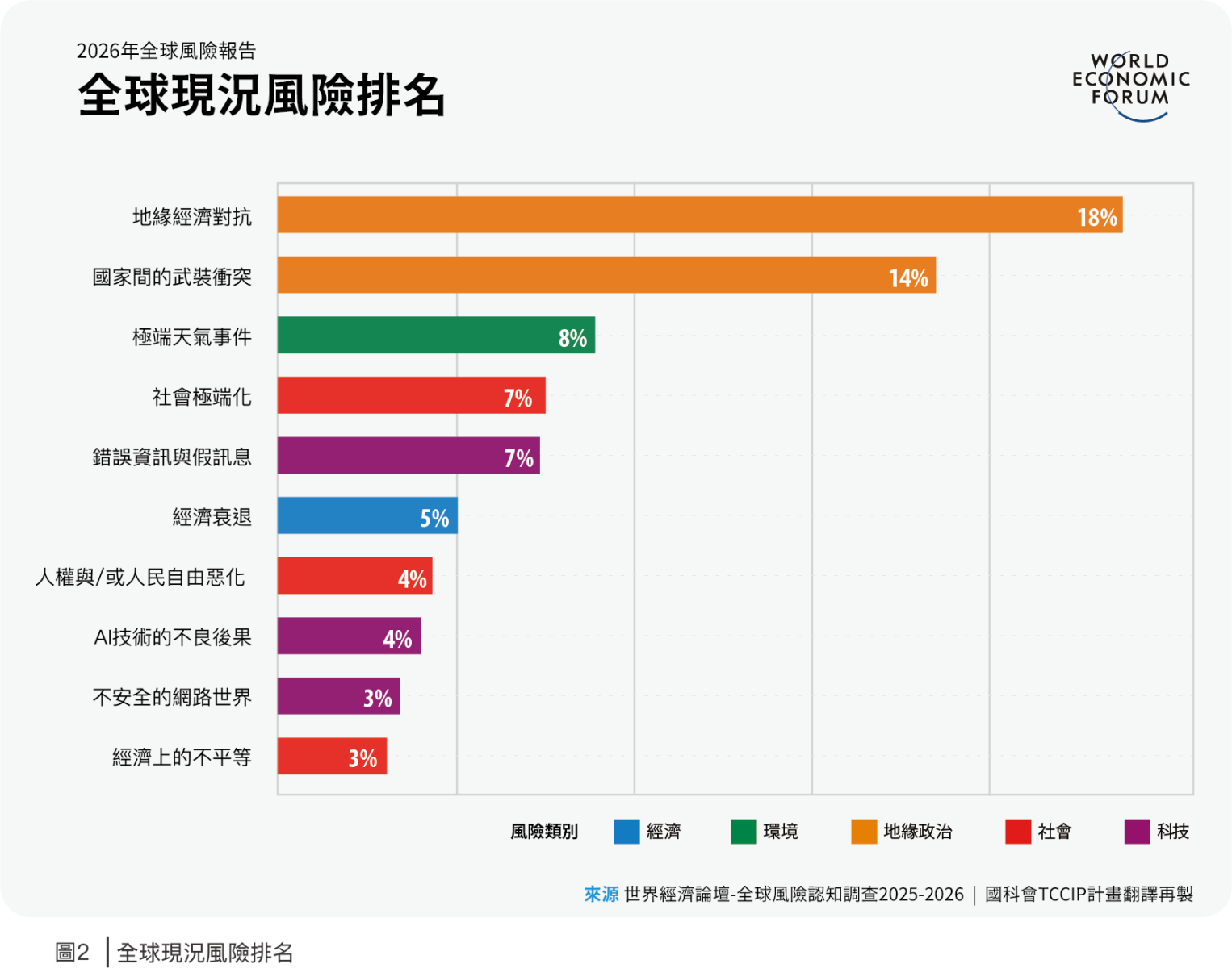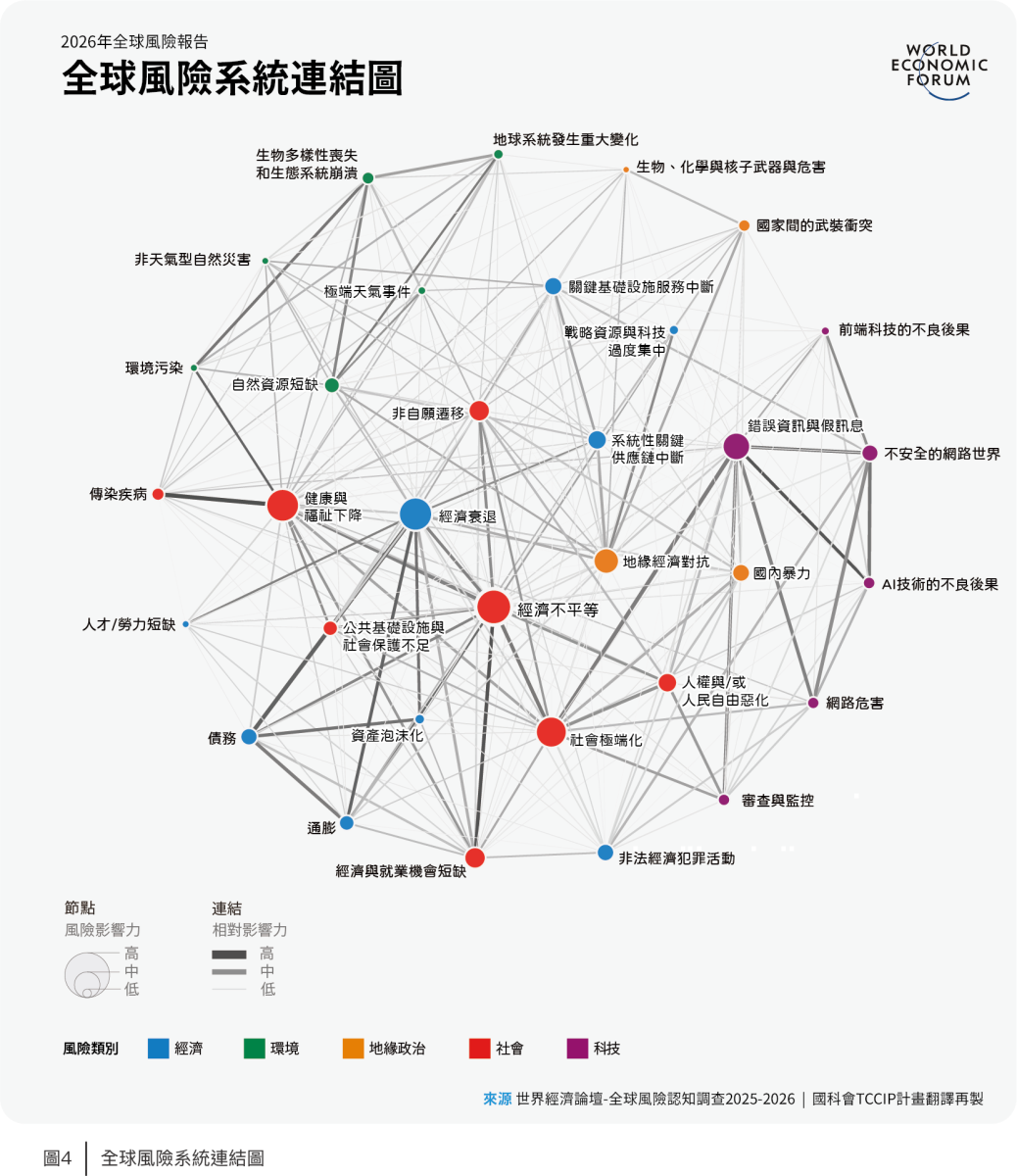2026年1月14日世界經濟論壇(World Economic Forum, WEF)發布《2026年全球風險報告》(Global Risk Report 2026,以下簡稱本報告),依據1,300多名學術、商業、國際組織、政府和公民團體等專業人員見解,分析現況、短期(2年)、長期(10年)的全球風險。