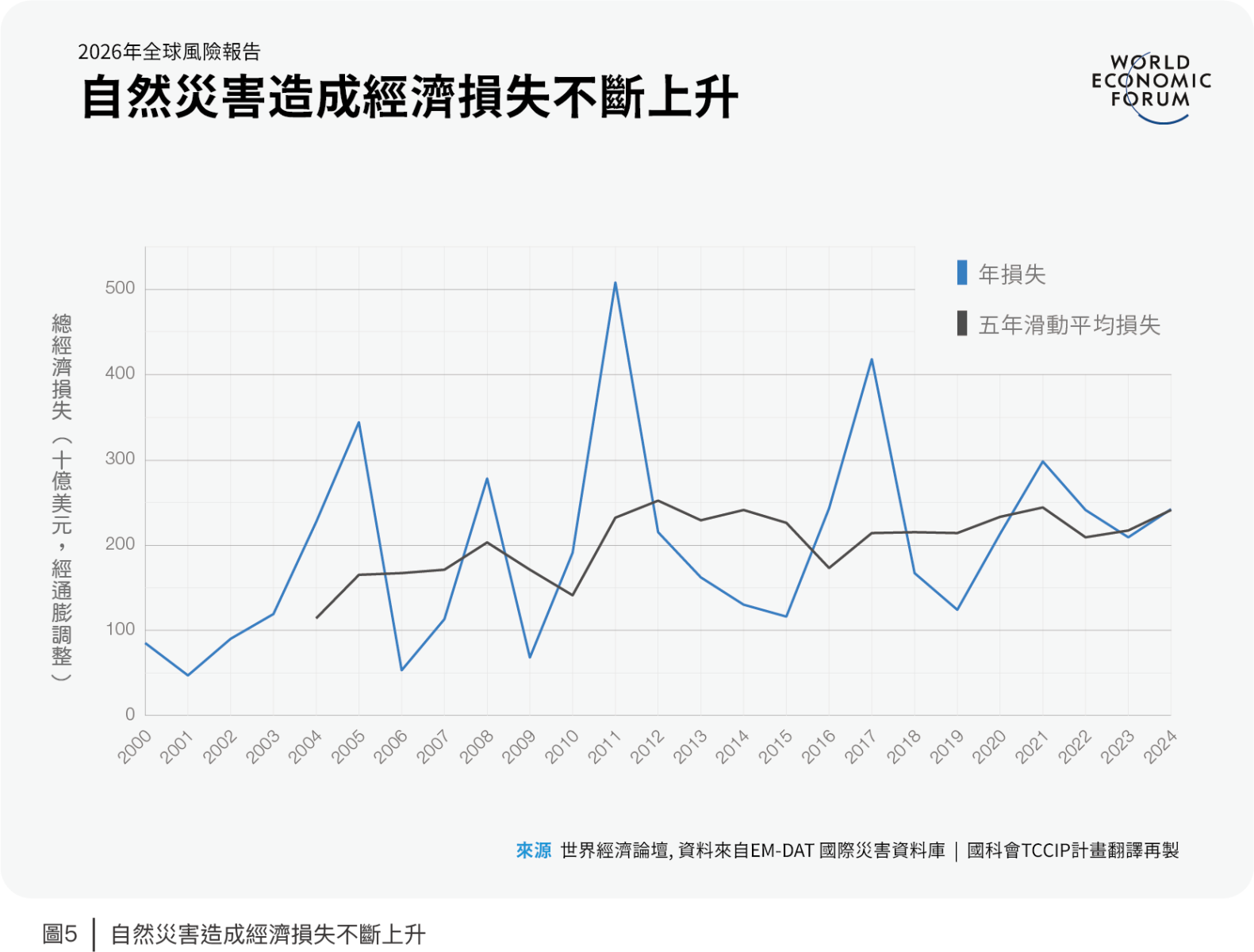 現代經濟體的關鍵基礎設施,正變得越來越脆弱,難以抵禦長期氣候風險(如海平面上升)與極端天氣事件(包括極端高溫、森林大火、洪水與颱風)。自然災害所造成的經濟損失正穩定上升 (圖5)。