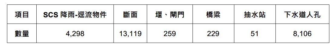 表1、臺南市淹水數值模型涵蓋物件統計表