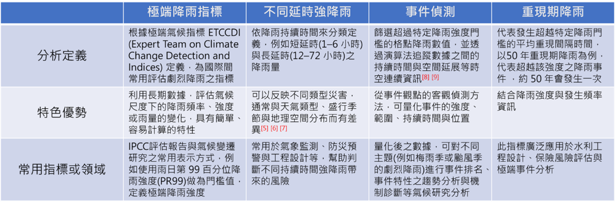 由於不同研究與應用領域需求,常用不同方式描述和量化劇烈降雨。為了更全面地描繪劇烈降雨特徵,本報告分別收錄了極端降雨指標、不同延時強降雨、劇烈降雨事件偵測與重現期降雨強度,四種常用的分析方法,透過不同時間尺度觀點呈現劇烈降雨特性。其整合簡介可參見表1。本期電子報節錄報告內容,以TCCIP網格化降雨日資料進行極端降雨指標與事件偵測分析結果為例說明。