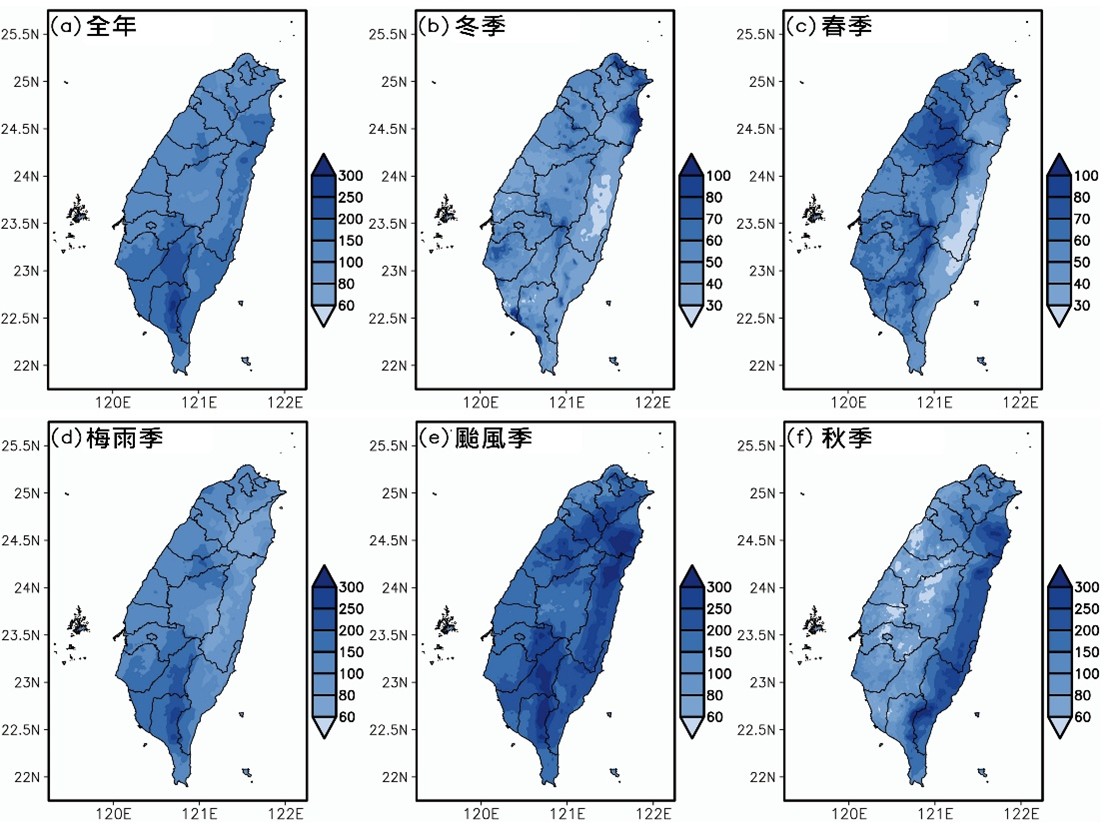 圖2、使用TCCIP 網格化降雨觀測資料 (空間解析度1公里) 呈現1960-2023年間的臺灣(a)全年及(b-f)五個自然季節的PR99極端降雨指標分布,色階代表極端降雨量的數值大小,單位為毫米。五個自然季節定義分別為(b)冬季(12月至1月)、(c)春季(2月至4月)、(d)梅雨季(5月至6月)、(e)颱風季(7月至9月)及(f)秋季(10月至11月)。由於季節間PR99值差異明顯,繪製冬季與春季的色階間距較小。(本圖截取自2025臺灣氣候分析系列報告)