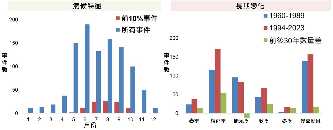 以事件偵測方法[8] [9]分析TCCIP網格化觀測日降雨資料[1] [2] [3]於1960-2023年間臺灣劇烈降雨事件,從季節統計來看(圖3a),劇烈降雨事件發生主要集中在5–10月,其中 6 月與 8 月為兩個高峰,而所有事件中排名前 10% 的劇烈降雨事件,也幾乎都發生在5-10月區間,對應了此時期活躍的梅雨鋒面與颱風活動。若將侵臺颱風於各自然季節中獨立篩選出來為一類,並比較劇烈降雨事件在各自然季節以及侵臺颱風類別中,於1960–1989 年與 1994–2023 年兩個時期的變化(圖3b),顯示梅雨季事件數增加最為顯著;冬季與春雨季雖然事件數量少,但相對增加率較高;秋季劇烈降雨事件數亦為增加。相較之下,侵臺颱風與颱風季的事件數量變化相對較小。整體而言,臺灣劇烈降雨事件近30年呈現增加趨勢,主要來自梅雨季、秋季與侵臺颱風。