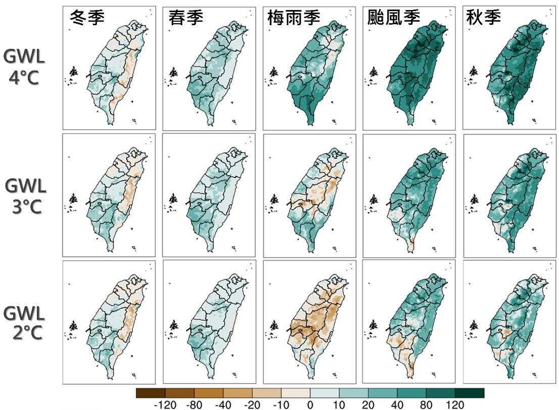本次報告進一步評估PR99極端降雨的頻率與總雨量變化:在春雨季、梅雨季、颱風季與秋雨季,臺灣的極端降雨頻率與總雨量皆隨暖化程度增強而增加,特別是GWL 4°C的增幅明顯高於GWL 2°C與GWL 3°C;冬季極端降雨變化幅度較不明顯。整體而言,統計降尺度推估顯示,隨著暖化程度增強,在主要降雨季節的極端降雨將增強且更為頻繁,更加凸顯暖化趨勢下的降雨豐枯差距。
