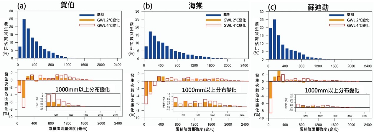 圖5、颱風進入距離 臺灣300 公里期間之陸地累積降雨量強度之強度頻率分布。(a) 上圖為賀伯颱風於基期模擬,以及相較於基期,在 GWL 2°C之變化 (下圖:橘色實心直條) 以及 GWL 4°C之變化(下圖:紅色空心直條)。右下角縮圖為 1000-2400 毫米區間的變化(單位:%)。(b-c) 同圖 (a),但為 (b) 海棠與 (c) 蘇迪勒的結果。(本圖截取自2025臺灣氣候分析系列報告)